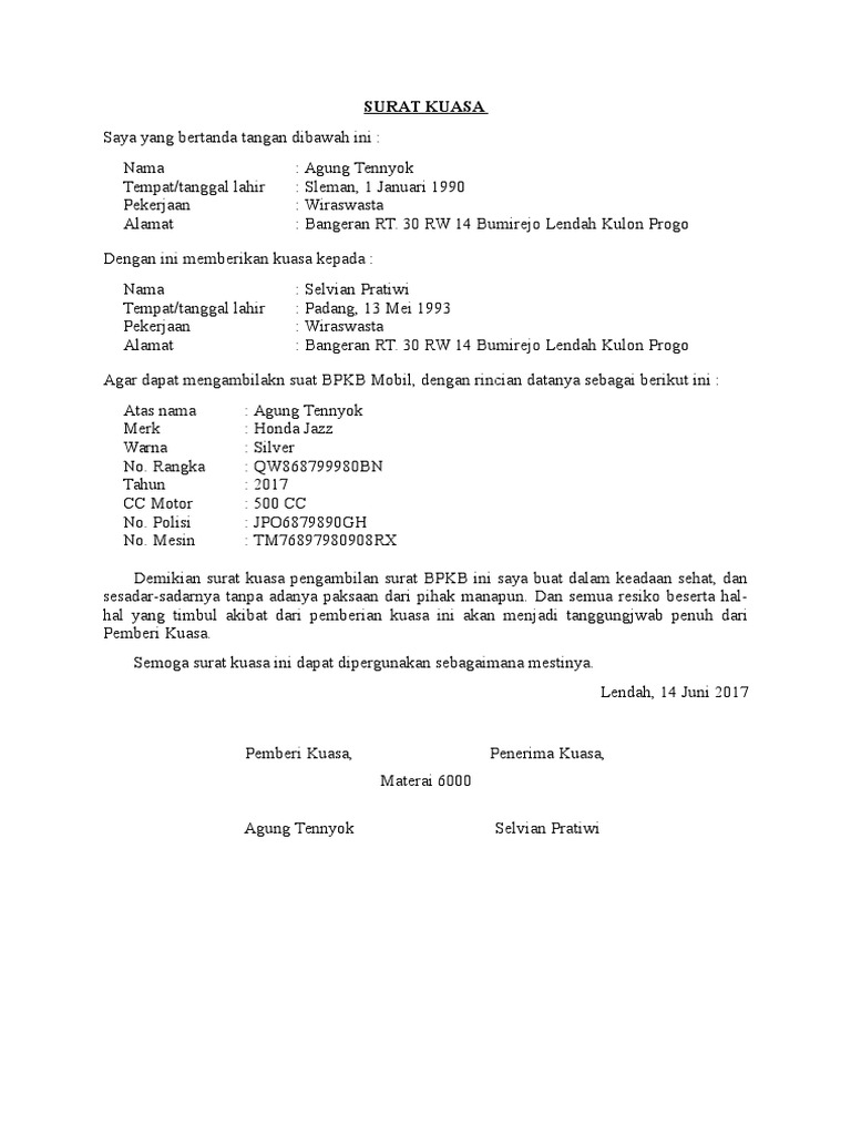 Pada bagian ini dijelaskan siapa yang bagian ini diisi oleh tanda tangan semua pihak yang terlibat dalam surat kuasa ini. Tulisan ini membahas pengertian, fungsi, dan contoh surat kuasa yang sering kita butuhkan. Namun, kadang si pemilik bisa saja tidak bisa mengambil langsung hal itu, karena berbagai uzur atau halangan, atau. Contoh surat kuasa dalam berbagai keperluan. Surat kuasa ada banyak sekali jenis serta formatnya, tergantung pada kebutuhan. Contoh surat kuasa perwakilan memang kerap kali dibutuhkan saat seorang tidak bisa melakukan secara langsung sebuah pekerjaan namun masih tetap menginginkan pekerjaan/suatu hal itu surat kuasa bermaterai rp 6.000 sebagai dasar hukum yang mengikat untuk sistem administrasi tersebut. Surat tersebut dinamakan surat kuasa. Copyright surat kuasa yang bertanda tangan dibawah ini : Surat kuasa ini dibuat karena seseorang yang berkepentingan sedang berhalangan sehingga tidak dapat melakukannya sendiri maka menyuruh orang lain dengan memberikan surat. Salah satu perihal penting tersebut adalah mengurus. Orang yang diberi kuasa tersebut akan menggantikan pemberi kuasa dalam berbagai tujuan maupun pekerjaan. Contoh surat kuasa pengambilan bpkb bermaterai. Bagi yang ingin mendownload contoh surat/arsip surat/format surat diatas dalam bentuk word silahkan ambil di google drive dibawah ini, atau klik download di bawah tampilan surat.