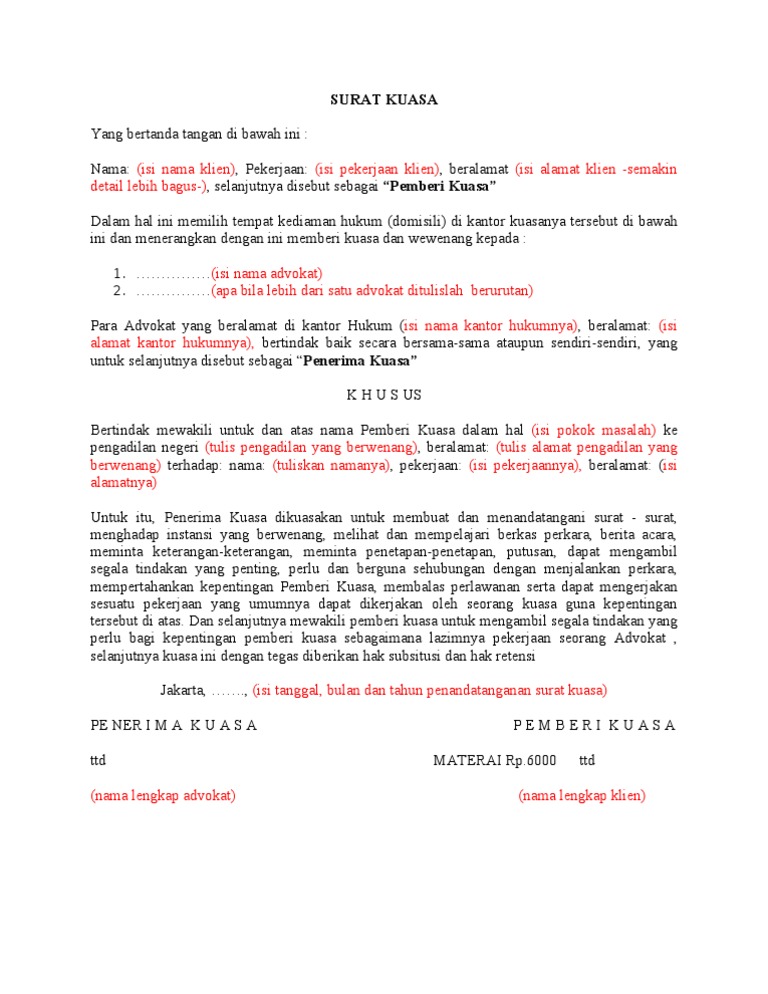 Surat kuasa khusus meliputi kegiatan tertentu yang dialihkan ke penerima kuasa. Contoh surat kuasa pengambilan ijazah. Surat kuasa istimewa adalah surat yang diberikan oleh seseorang kepida pihak lain, misalnya kepada pengacara, yang bertujuan untuk menyelesaikan suatu permasalahan yang ada kaitannya dengan. Anda bisa membuat surat kuasa seperti dibawah ini untuk memberikan kuasa kepada pengacara. Seorang pengacara akan leluasa bekerja dan membela anda setelah mendapatkan surata kuasa tersebut.