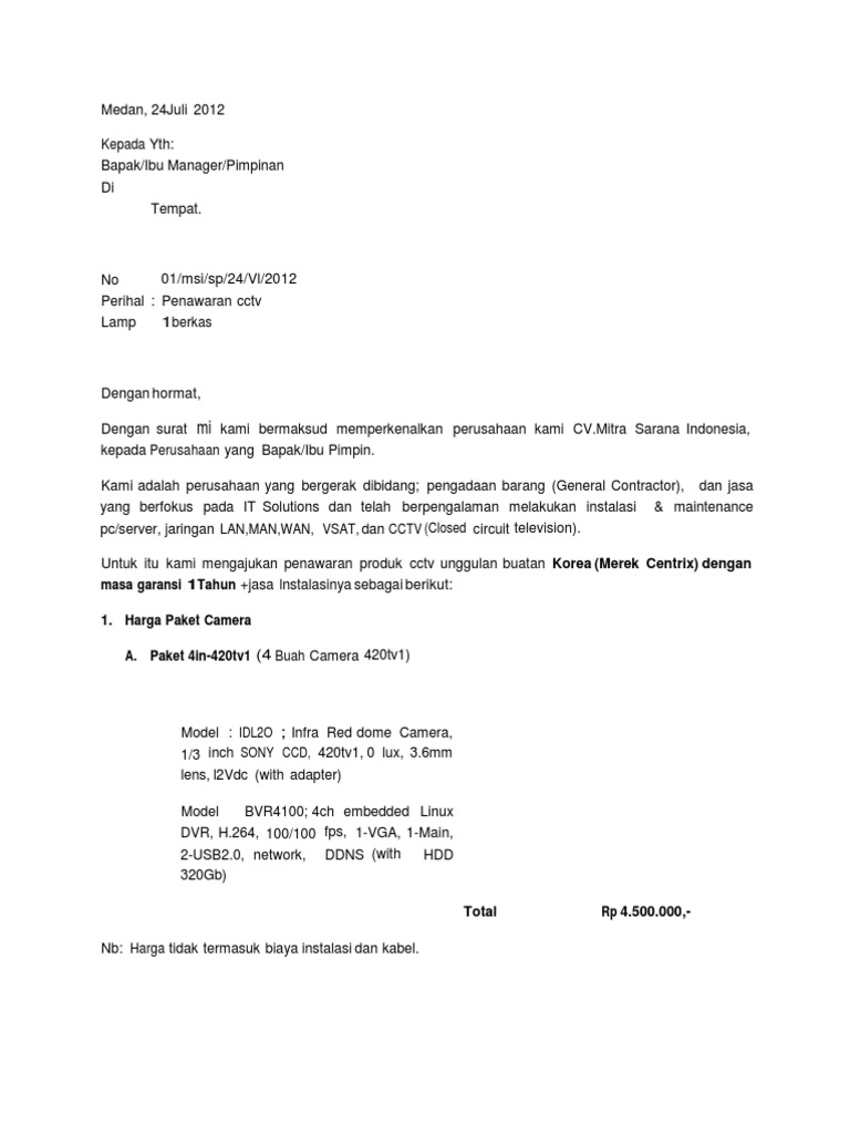 Ada berbagai macam surat penawaran barang yang mungkin akan dipergunakan dalam menjalankan perusahaan. Contoh surat penawaran merupakan salah satu dari surat resmi yang sangat penting bagi seorang pengusaha, pedagang, jasa dan barang. Semoga bapak/ibu tertarik untuk melanjutkan kerja sama ini. Jika anda menggunakan bahasa yang tidak formal meskipun sebenarnya anda memiliki penawaran yang layak. Untuk menunjang kelancaran pekerjaan, dibutuhkan support mekanisme pembayaran yang kami tawarkan adan tiga macam mekanisme.