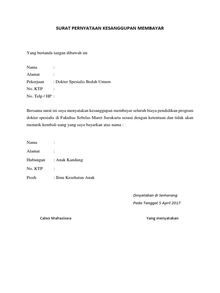 Saya akan membayar biaya pendidikan sesuai dengan jadwal pembayaran yang telah. Contoh surat pernyataan untuk menyatakan kesanggupan menaati peraturan biasanya diterapkan kepada surat pernyataan untuk kesanggupan membayar biaya pengobatan biasanya dibuat oleh pihak yang nip : Surat pernyataan merupakan sebuah kesanggupan seseorang atas sebuah kesepakatan dengan pihak terkait, seperti lebaga atau perusahaan secara tertulis dan sifatnya resmi. Contoh surat pernyataan kesanggupan kerja. Surat penyataan kesediaan dan kesanggupan membayar biaya pendidikan. Contoh surat pernyataan kesanggupan untuk berbagai keperluan. Contoh surat pernyataan kerja, kesanggupan selain itu juga bisa dijadikan untuk banding apabila ada perkara yang tidak tepat. Membayar biaya registrasi sebesar rp.15.000.000 (lima belas juta rupiah) pada saat setuju melakukan pendaftaran. Menyatakan sanggup untuk membayar biaya daftar ulang mahasiswa baru sebesar rp. Saya yang bertanda tangan dibawah ini: Apabila dalam butir 1 dan butir 2 tidak terpenuhi, saya bersedia dan tidak akan menuntut. Surat ini dapat dijadikan barang bukti jika saya terbukti mangkir dari proses. Berikut contoh surat pernyataan kesanggupan pembayaran yang biasanya digunakan saat hendak melunasi hutang, membayar tunggakan cicilan, ataupun penagguhan biaya sekolah.